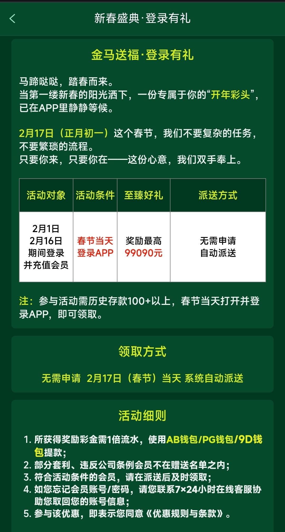 在2有1号到2月16号期间内有充值过100以上登入上账号就有彩金了,期间内充值过100以上符合才有,彩金一倍流水,只能AB/PG/9B钱包提款
